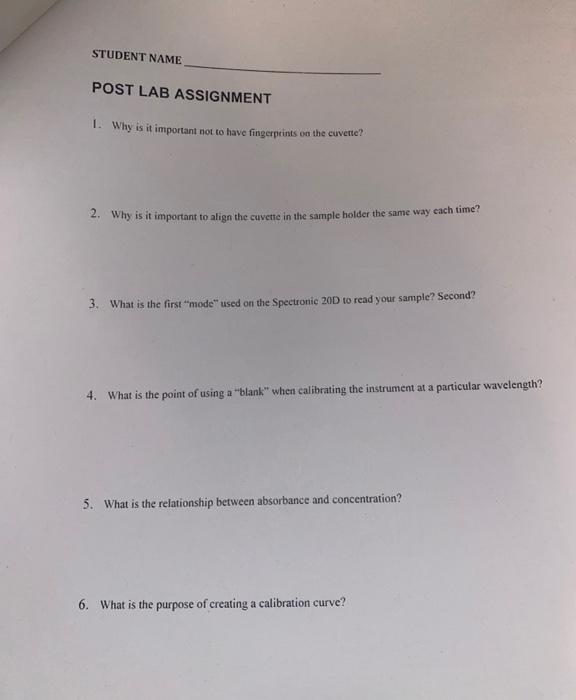 I will use th. Why is it important to align the cuvette in the sample holder the same way each time? Posted by 5 minutes ago. Why is it important to align the cuvette in the sample holder the same way each time? Why should the line on the cuvette be aligned with the sample holder? Apr 01 2022 09:17 am. Please help with this lab i have experiment 1 make a plot of absorbance readings for each of the solutions, absorbance vs. Experiment 2 calculate the actual concentration of cu2+ ion in your samples. View pl answer lab 2. pdf from chem 2a at university of california, davis.
